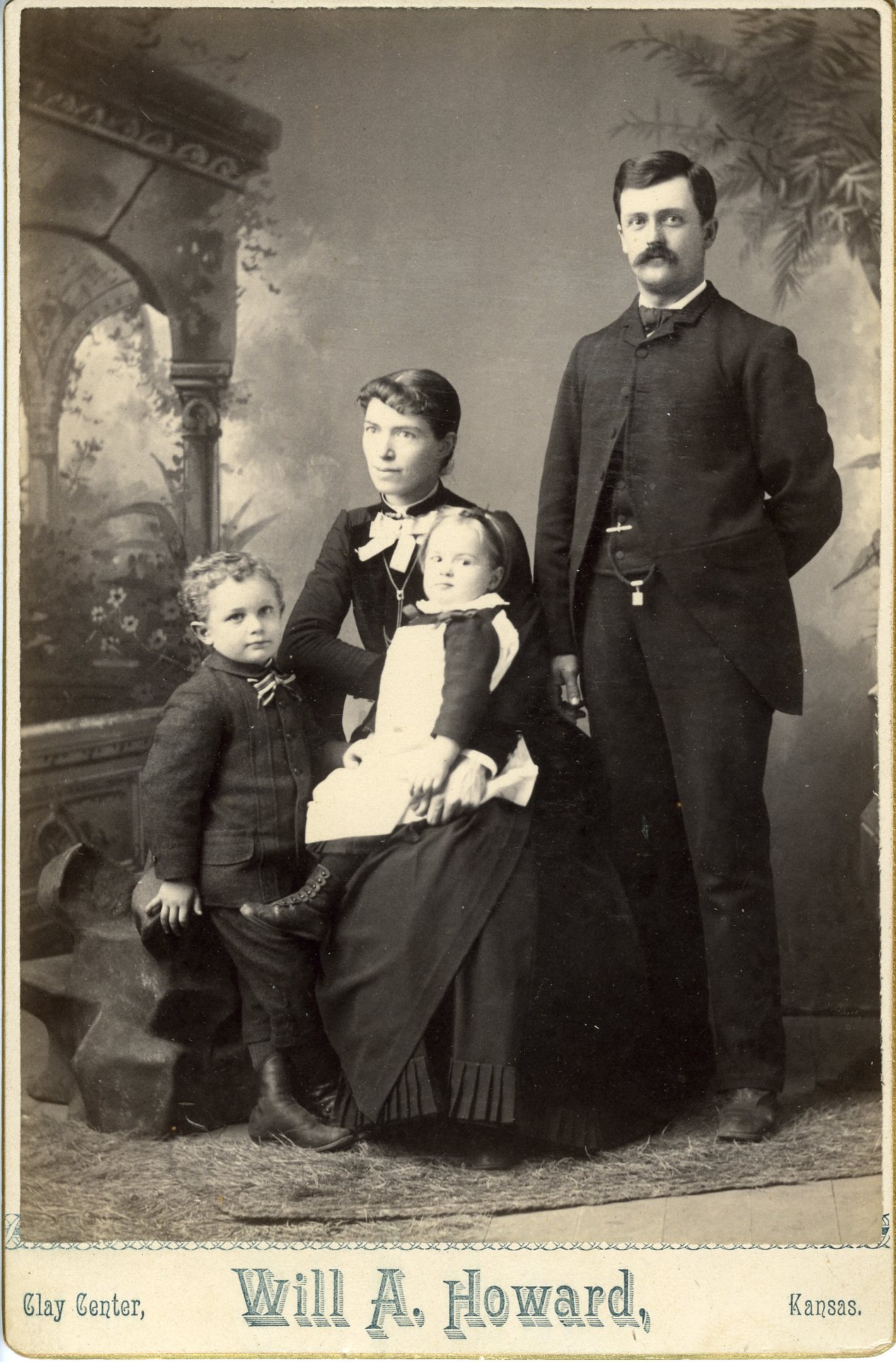 In trying to trace the photographer – again a challenge because there is a county in Kansas named Howard, it can never be easy, right – I learned that between 1870-1880, Clay County (where Clay Center is located) saw a population increase from about 2000 to over 12,000 settlers. Apparently many of those who emigrated to Kansas after the Civil War were veterans hoping to take advantage of their veterans benefits. It makes me thus wonder if Clyde’s father was a Federal veteran, or if they had family or friends who had come out to Kansas earlier who were veterans. Considering the previous family portrait in which the father’s left leg appeared not to be there, it is possible he was in fact a war veteran who had been injured, and after the family was settled, suggested their friends/family come out as well. It’s all complete speculation, but somehow it is fun to speculate at this late date.