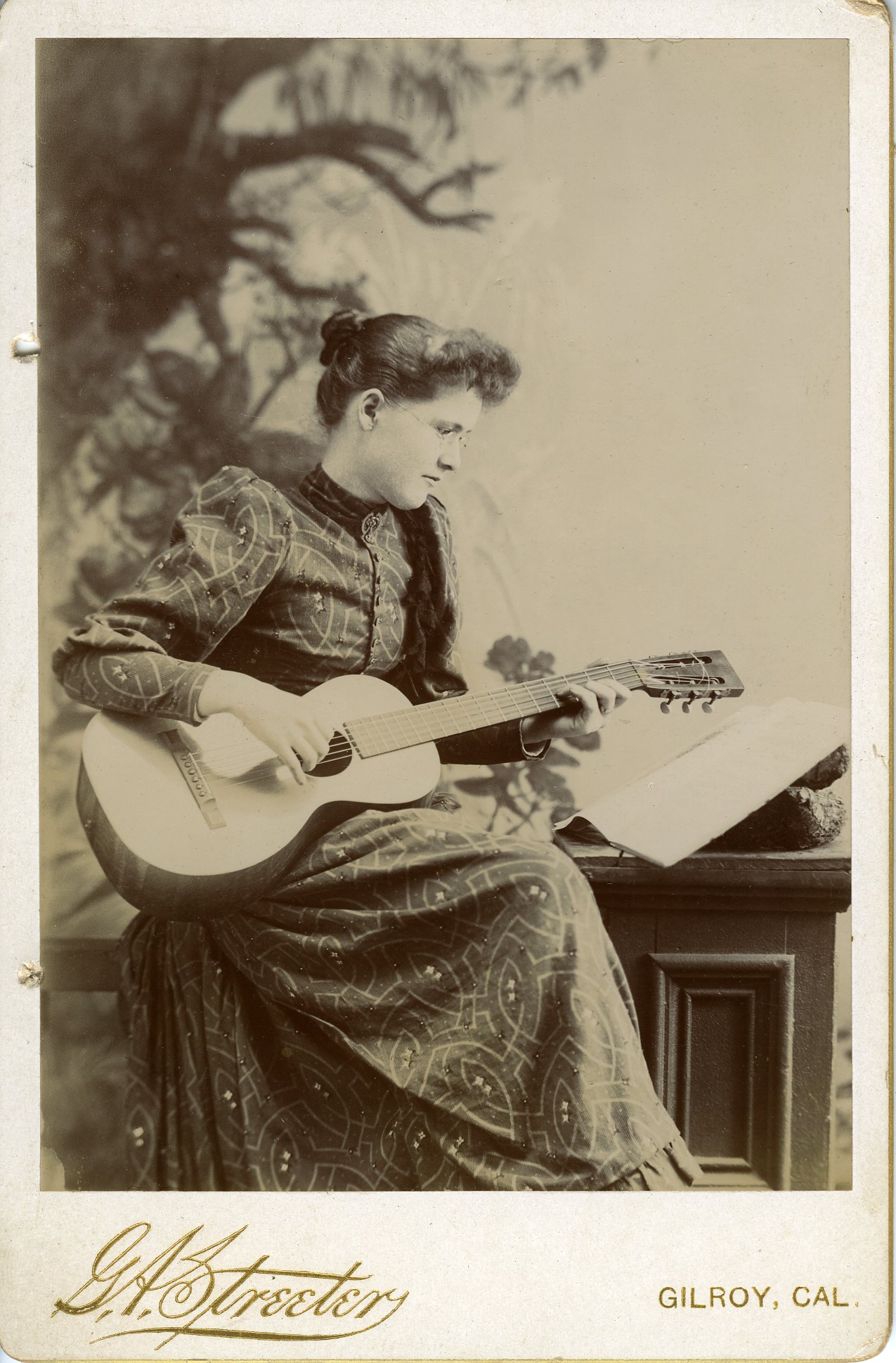 Today we feature who I believe to be Kate Parish Streeter, wife of Arthur Streeter and mother to this little girl. This is the final photo of this family from the C. Murray Album, though not the last photo in the book. Again the photograph is of a subject and an object, e.g. she is playing a guitar. Apparently, the guitar enjoyed a period of refinement as a parlour instrument during the later Victorian era and into the early 20th century, and often was played by ladies during a soiree to entertain their guests. At its peak, the guitar was considered to be a classical instrument along side the harp, flute and violin, as representatives of the highest European musical tradition. I do wonder if Kate took lessons and whether she was any good.