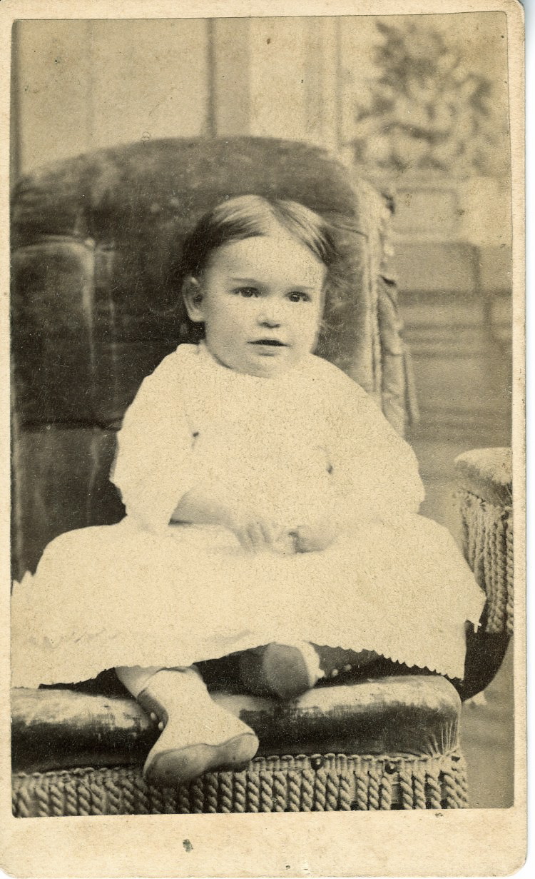 This is a Civil War era CdV from a group I bought online. There is no photographer information and no identification of who the child is. She’s a pretty girl though – center parted hair tells us that. Look at those shoes, buttoned up to the ankle. The soft soles of the shoes are fairly typical for early walkers, so she may be around a year to 18 months old.