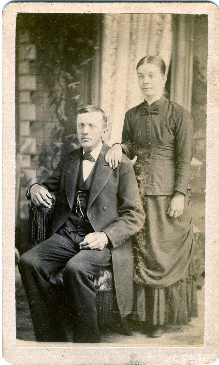 This is a CdV dating from the 1870s. I’m basing this speculation on the draperies of the woman’s skirt. You can see the draped apron flowing behind her and into a smallish bustle. Her bodice is fairly long and the poor woman has no bosom whatsoever. It’s strange how the fading of the photo affected the woman’s side, but not the man’s side. I wonder if it was stored poorly, or exposed to sunlight, or even mangled during the gluing process which affixed it to the card.