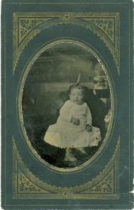 Today we have a tintype in a paper folder. There is no identification of the child in the image and this was purchased as part of a large lot of “old photos” off ebay. If you enlarge the photo, you can see what appears to be the arm of a parent reaching in from the right side and holding the child in place. It’s difficult to date a tintype because they were popular in various forms from 1860 through World War 2! However, it’s likely that this tintype is from 1865 to 1880.
