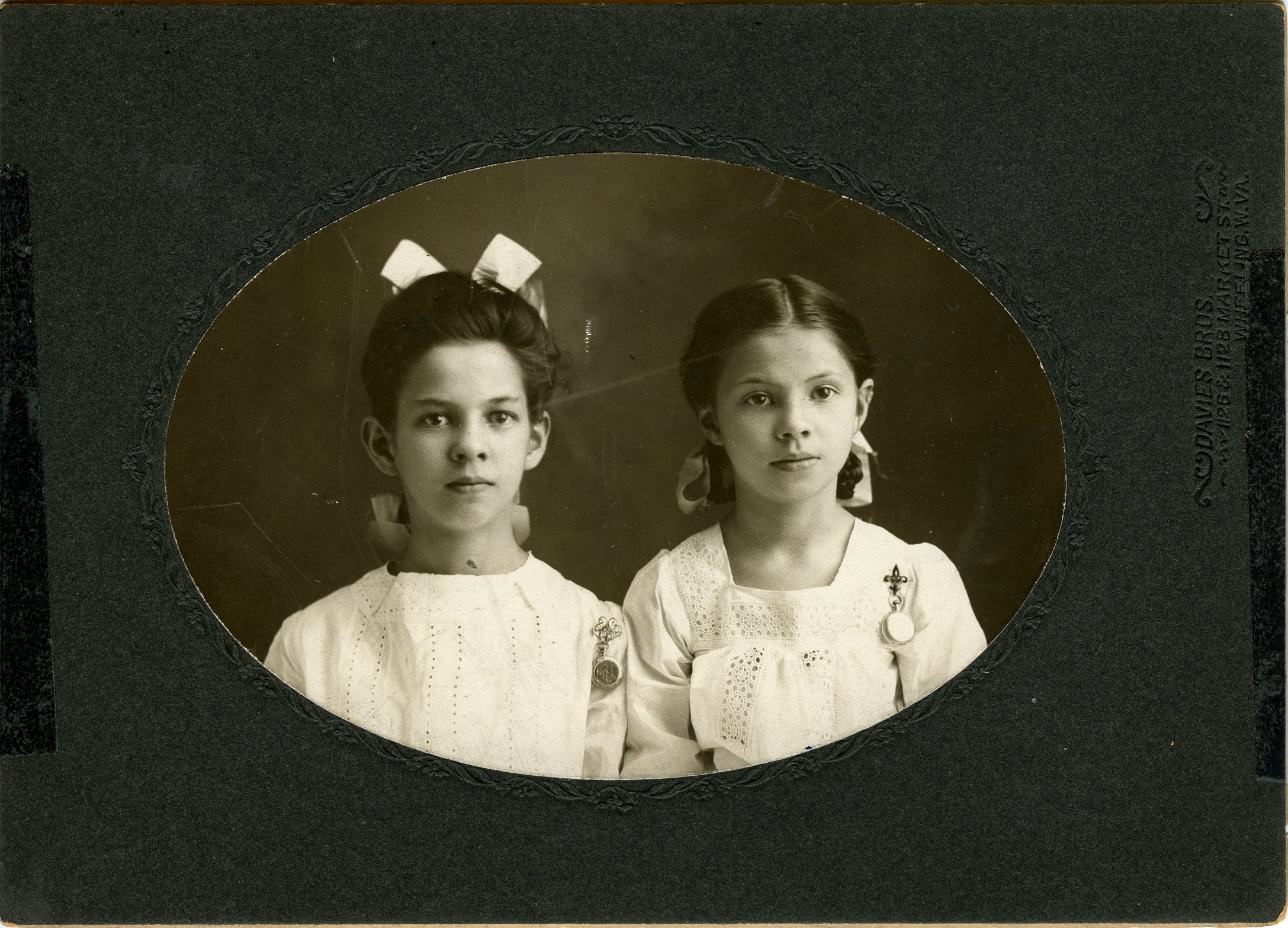 This lovely photograph is of Bendicta and Ruth Trunk, left and right. Based on some other information found with the photo and the great comments on a previous post, I believe this is a photo from their First Holy Communion. One of my readers said that these pins are Communion badges. The photographer was Davies Bros of West Wheeling VA, which is just across the river from Ohio. I’ll date this photo between 1910-1920. There will be more to come on Benedicta and her family so stay tuned.