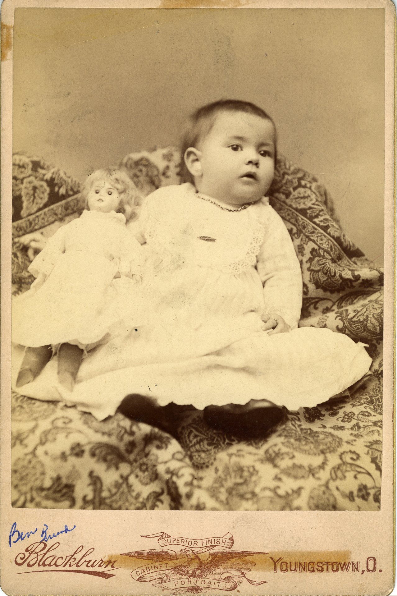 Babies are cute regardless of when they were born. Here is little Benedicta Trunk as an infant, maybe as young as 3-4 months as she’s sort of laying on the chair and not holding up her head very much. You can see the inscription below the photo that someone wrote “Ben Trunk.” I’m guessing this was her nickname. The photo was taken in Youngstown, Ohio by Blackburn.