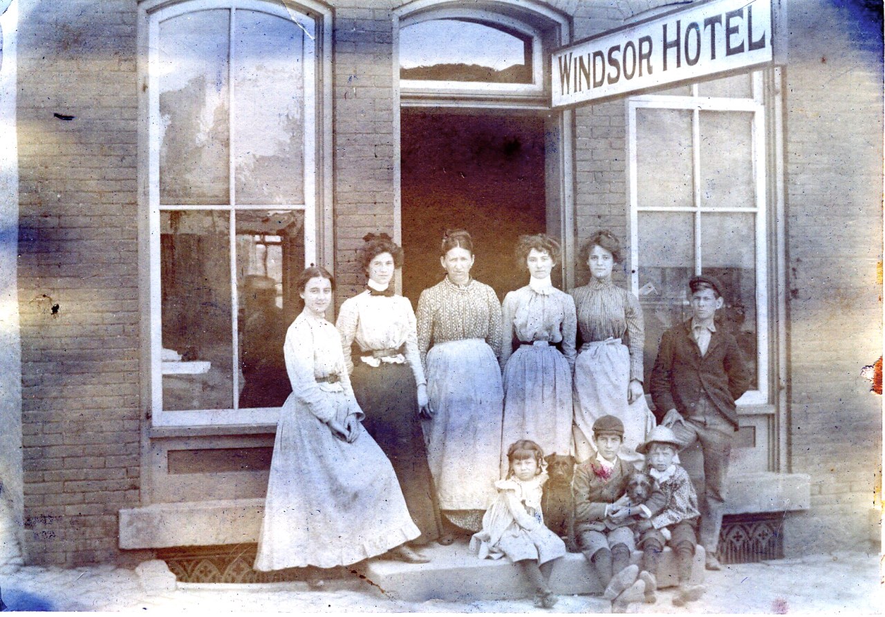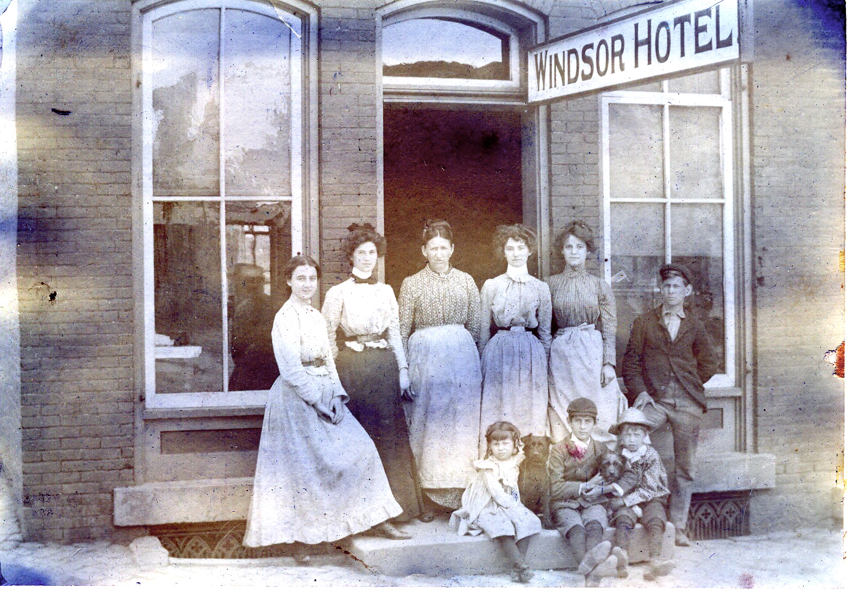 There are four young women, one older woman, one young man, two boys, one girl and two dogs. Also interesting is that if you look at the window to the left of the family, you will see someone in a straw boater. I assume this person is inside the hotel. I wonder if they owned the hotel?