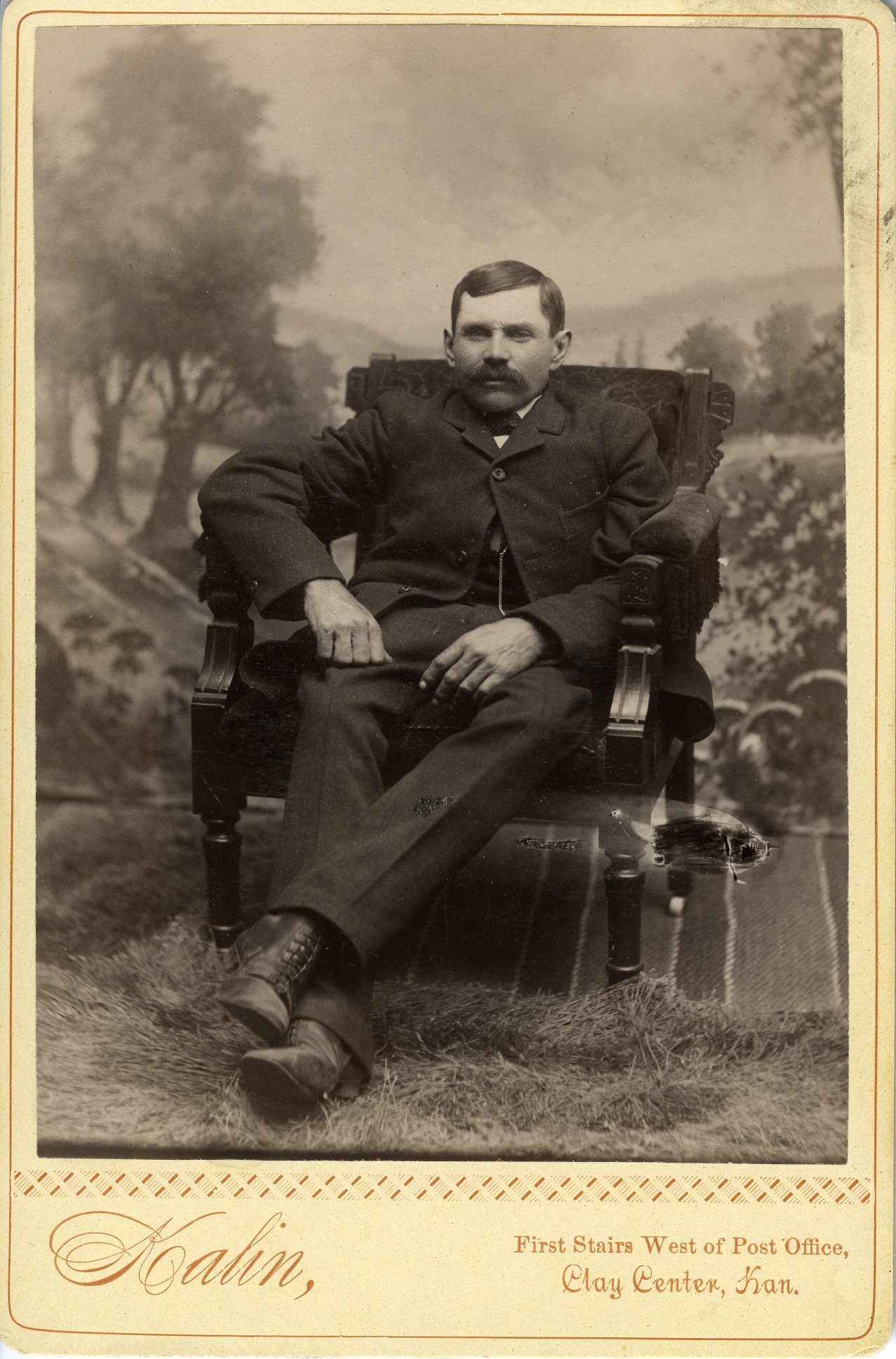 The photographer we have seen previously. Kalin was located in Clay Center, Kansas. Kalin was in business at least between 1890 and 1913. Since the majority of photos in the album are prior to the turn of the century, I’ll date this photo in the 1890s. The cabinet card is relatively simple with just a thin red line border.