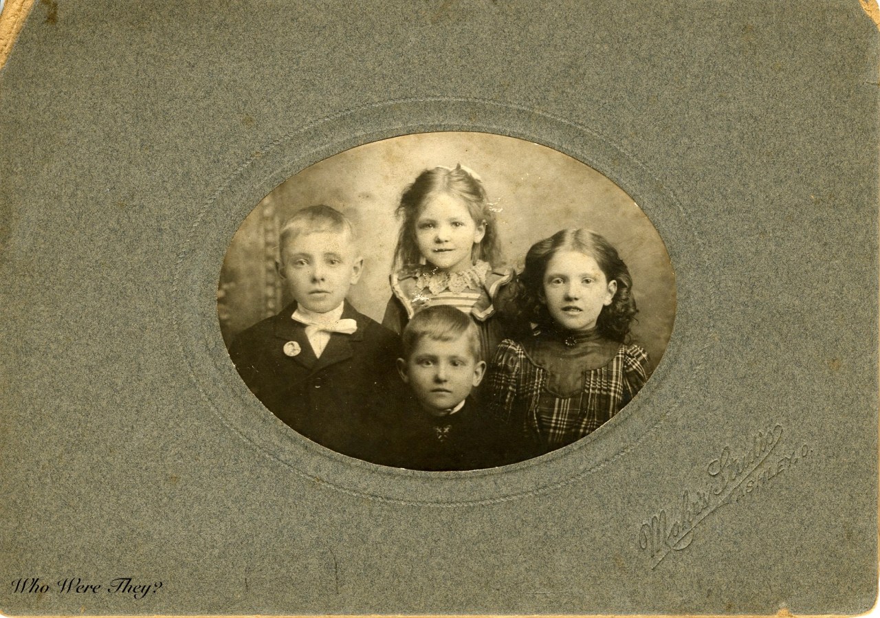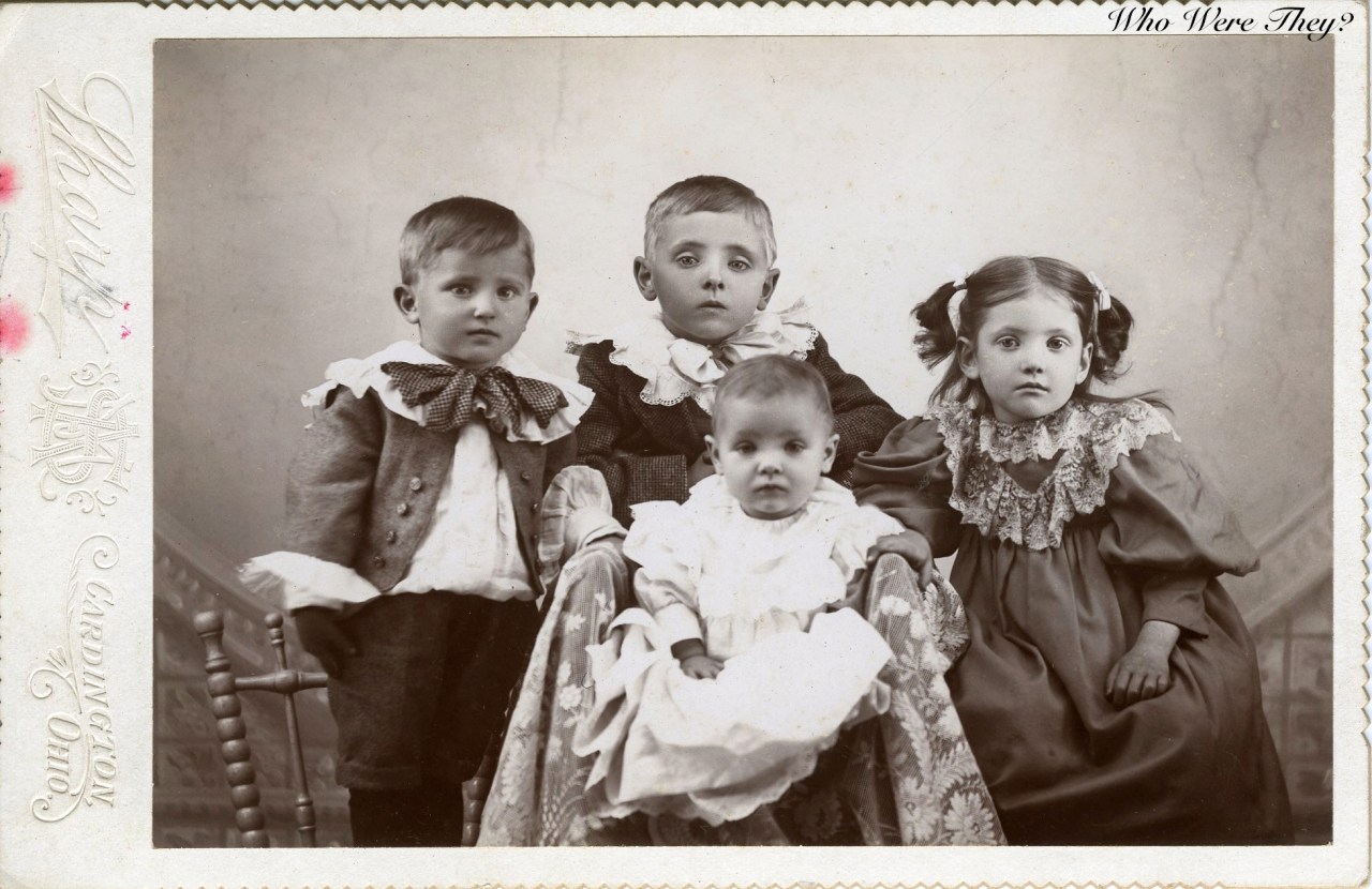 These are certainly the same children a few years earlier than the photo above. The scalloped/deckled edges were popular in the 1890s, so I am dating the younger photo as 1895 and the second photo as 1900. The photographers were Sharp in Cardington, OH and Mahr’s or Mahrl Studio of Ashley, OH.
