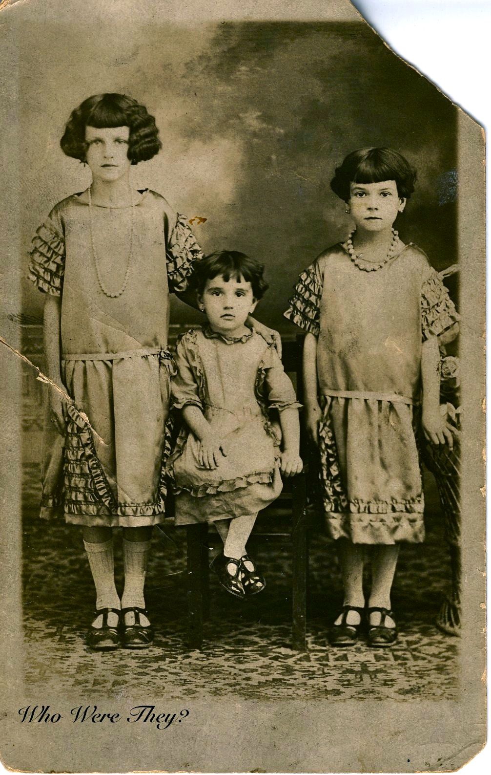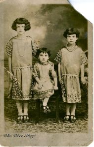 Again looking for treasures at Keepers, I found this large portrait of a family. The presentation card is actually much bigger than my flatbed scanner surface is long! They really knew how to present a photo back in the day, didn’t they? So, while continuing to dig, I then found the photo below, which is just the three girls, leading me to believe the fourth child is a son. The girls’ photo is on a photo postcard and it was torn in a couple places. Fortunately digital restoration can make such a difference and we can now enjoy their pretty faces for all time. You’ll notice that all their dresses match in terms of trims, and probably match their mother’s dress as well. I’m saying lavender dresses with white stockings and black shoes.
