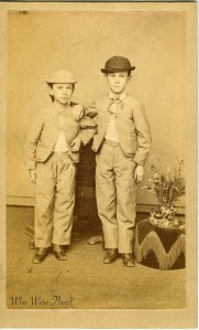 UPDATE: As I was studying the image of the two boys together, I wondered about the feet of some sort of table behind each boy, and then I realized they are positioning stands! Since the exposure time was long and a person had to remain still, body positioning stands were sometimes used for the best quality photo with no blur of movement. I’m excited to see evidence of these positioning stands. I believe there is also one in use in the photo of the man and the boy – look between the boy’s feet.