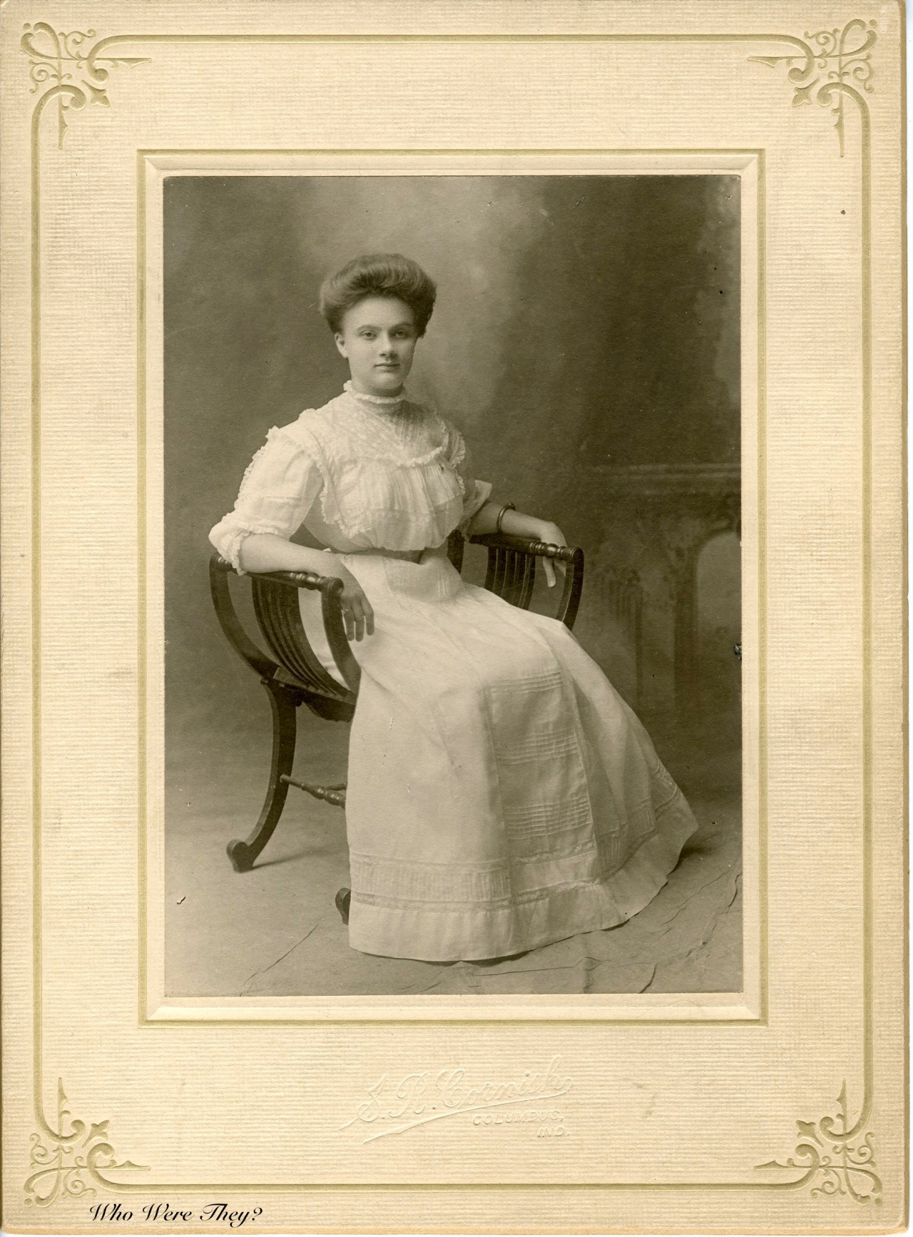 This photo is one of the batch I bought at Keepers, and I can see this lovey image framed and on someone’s piano, perhaps in the sunny conservatory. The hairstyle is the late 19th/early 20th century Gibson Girl style although the dress leads me to believe it’s a bit later, perhaps early teens. The girl looks quite young in the face; she’s wearing a bracelet on her left arm and possible a ring on her right ring finger. The photographer name is S. R. Cormish or Cornish of Columbus, Indiana.