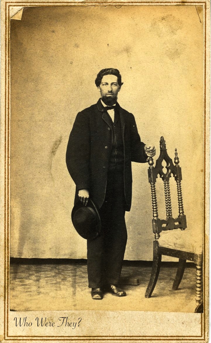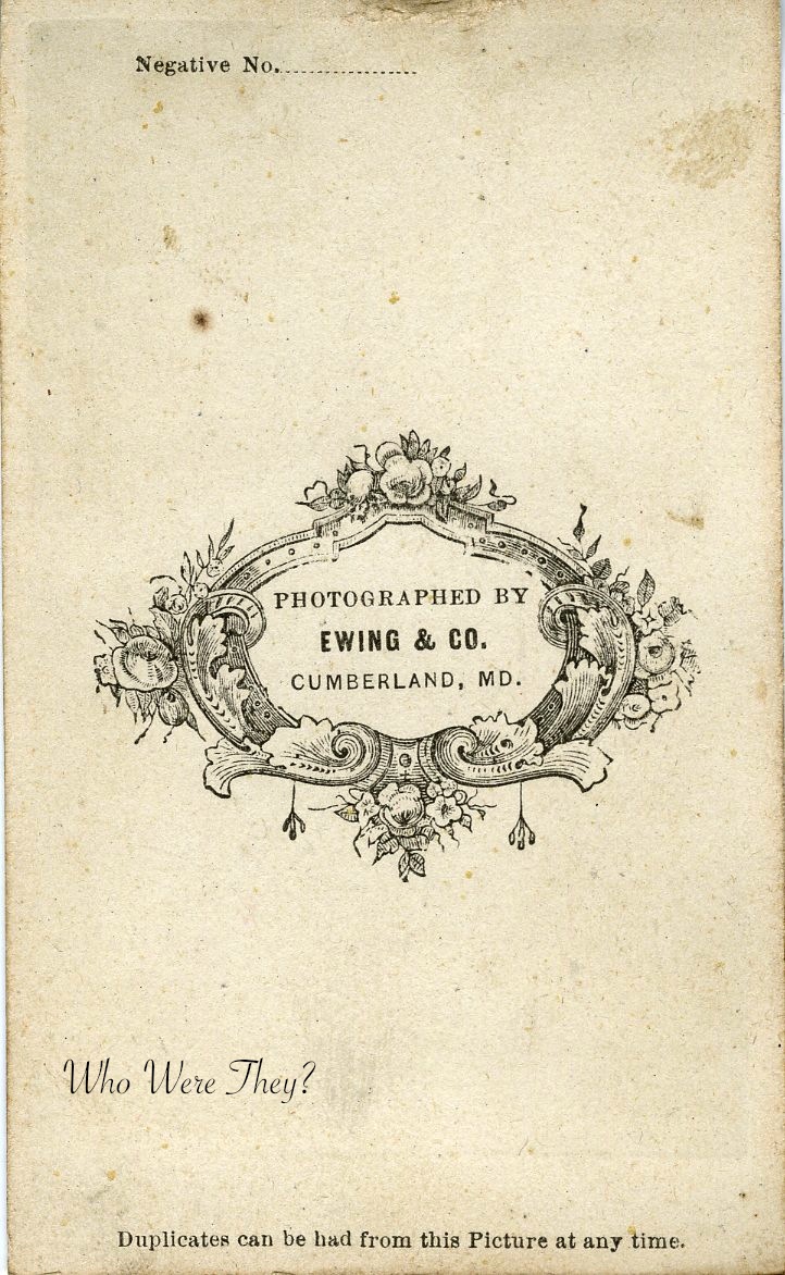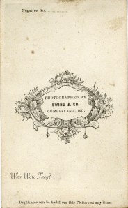 This man’s beard seems to only cover his chin. I’m certain there is a modern name for this phenomenon but I have no clue what it would be called. He’s got a thick head of hair, too. Now that we are aware of the positioning stands, notice the foot of a stand behind his feet; it almost looks like a third foot. Again the two thin lines indicate the CdV is from the 1862-1863 timeframe. The photographer was Ewing & Co, from Cumberland, MD. Makes you wonder if this fellow was involved in the war or somehow managed to avoid it.