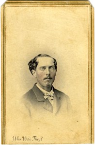 This photograph from the early 1860s (1862-1863) is a nice bust of a handsome fellow sporting a small mustache and skinny beard, a la Colonel Sanders, but more likely General Custer considering the time frame. The poor fellow is suffering from a severely receding hairline which may have been his inspiration to flourish his hair elsewhere. The cheeks of this photograph are tinted as well. The photographer was F. Forshew of Hudson, NY. The bottom edge of the bristol board has been cut as have the upper corners, probably so it would fit into a frame or photo album.