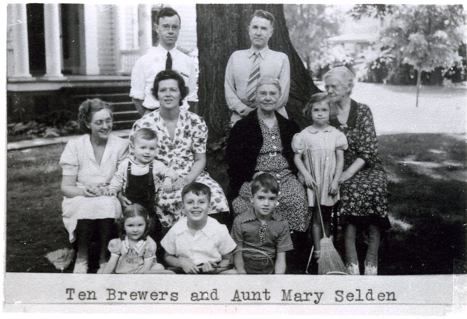When I first found this photograph, I knew who some of the people were, but I had to ask my mother about the rest. I love this photo, because it shows a very young Gramma Alice (my mother) as well as my Grandma Pat, my uncles and some other relatives I never met. And I also love how my grandfather titled it – Ten Brewers and Aunt Mary Selden – as though Aunt Mary was the third wheel. She was my grandfather’s mother’s sister. My people are George & Pat Brewer and their kids Chuck, Alice & Ed. Here’s what my mom had to say about the people in the photo: