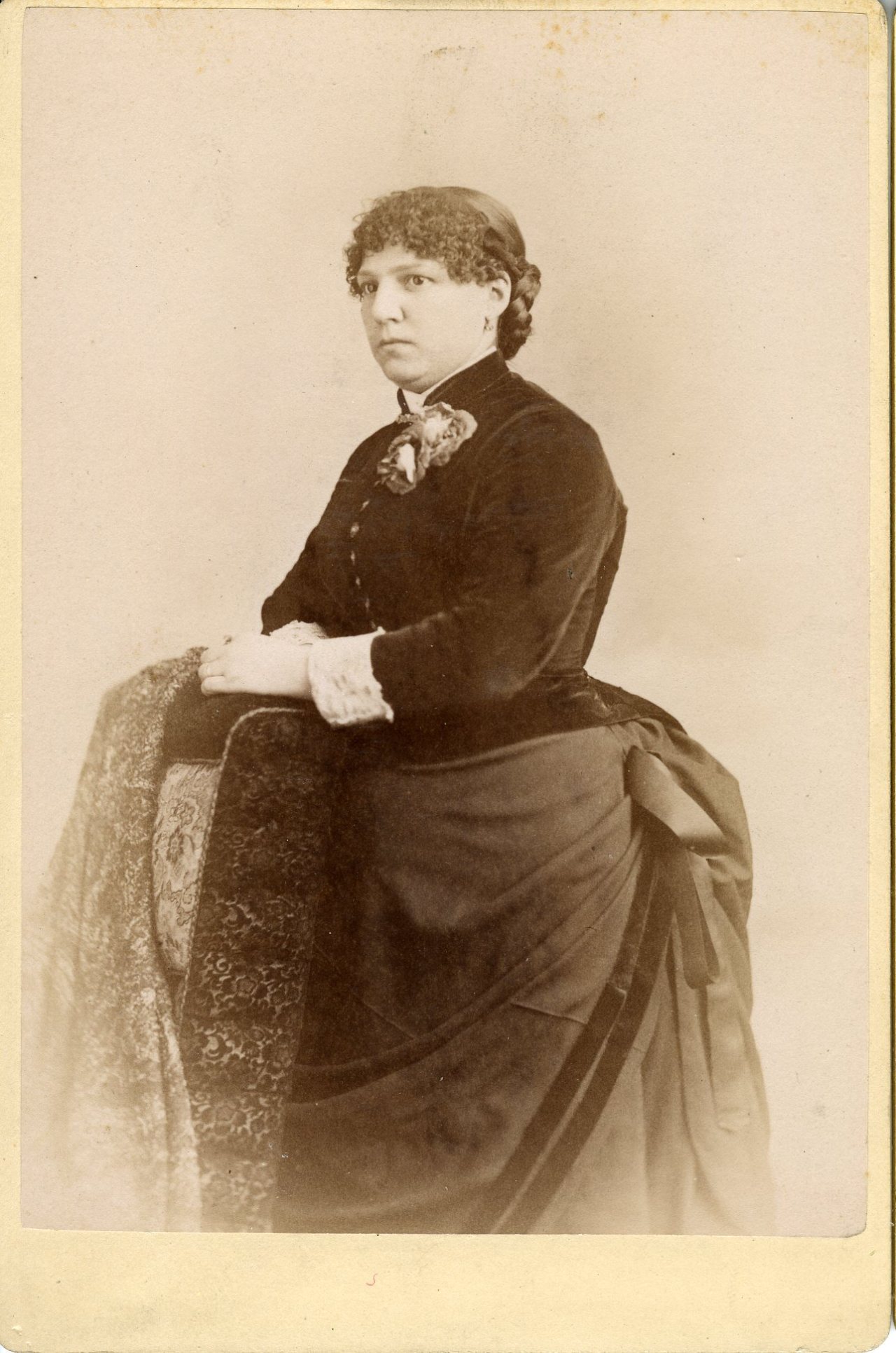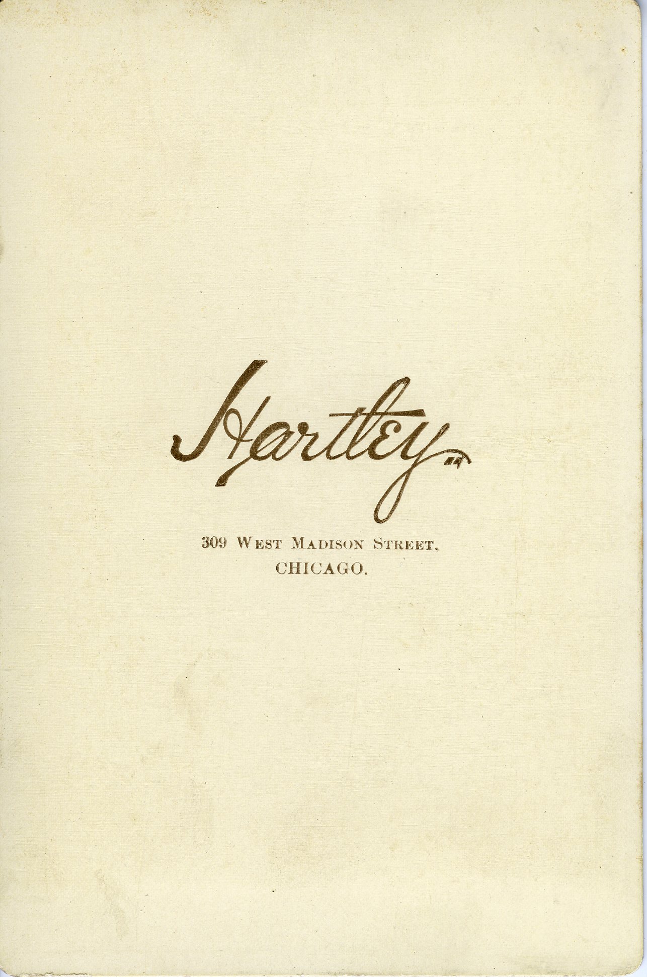Directly to the right of our “bewildered” subject in the last post is this woman in her amazing bustle dress. This is definitely late bustle (1882-1889) because of the size and prominence of the bustle, plus the gorgeous drape with what looks like velvet trim on probably wool gaberdine or the equivalent. I picture this in rose red velvet and nut brown wool, which was popular on the fashion plates of the time. Again the photographer is Hartley, a popular choice for the family.