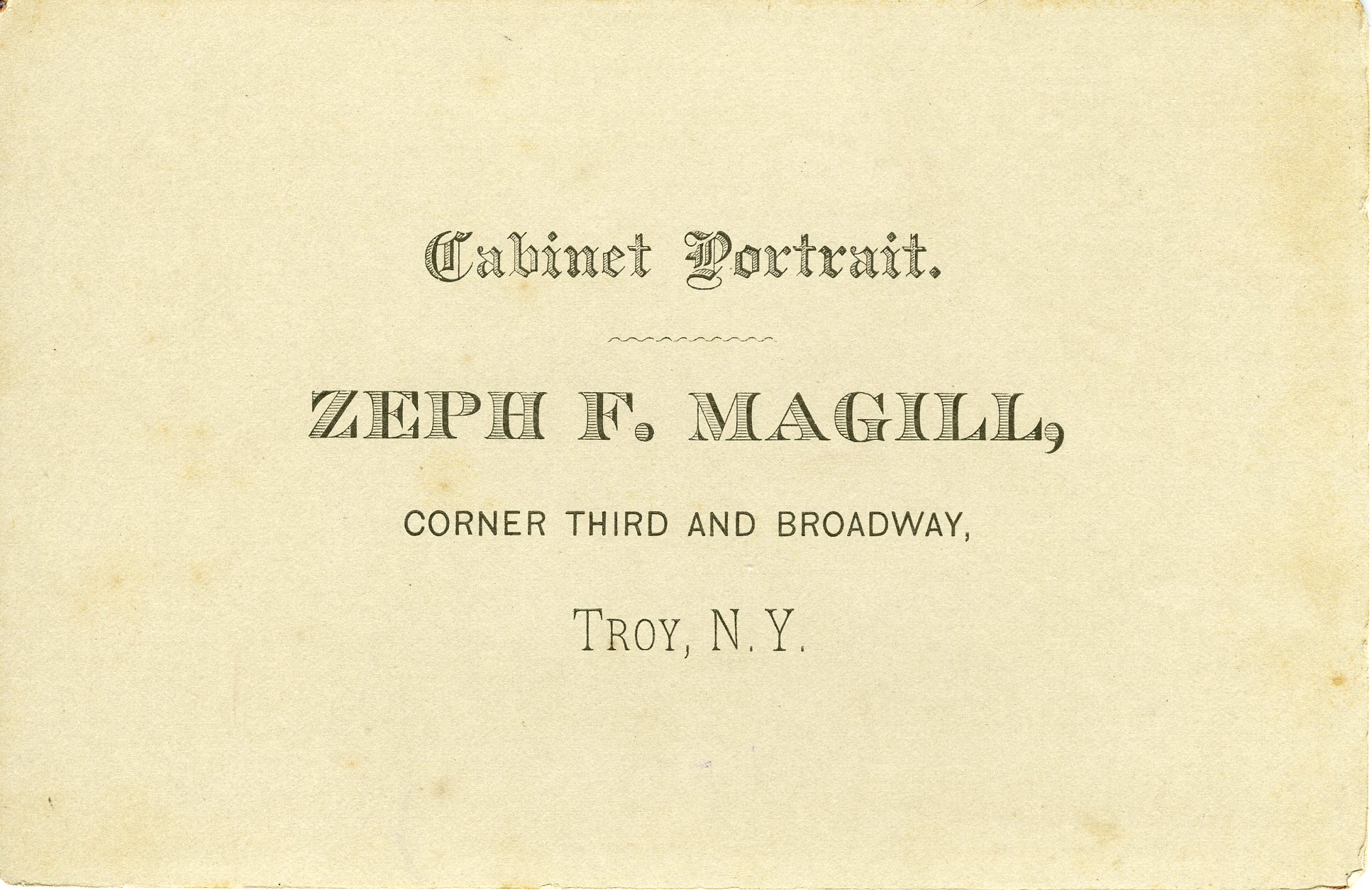 The photographer is Zeph. F. Magill, who purchased the business from a Mr. Clark. Earlier cabinet cards by Magill state “successor to Clark” instead of the studio location. Zeph. F. Magill was somehow involved in politics and fertilizer, oddly coordinating lines of business and could also be identified as Zeph. T. Magill who was somehow associated with a criminal arrested for fraud. Such an odd name could not be easily duplicated, but an F can look like a T and vice versa. Hmmm.