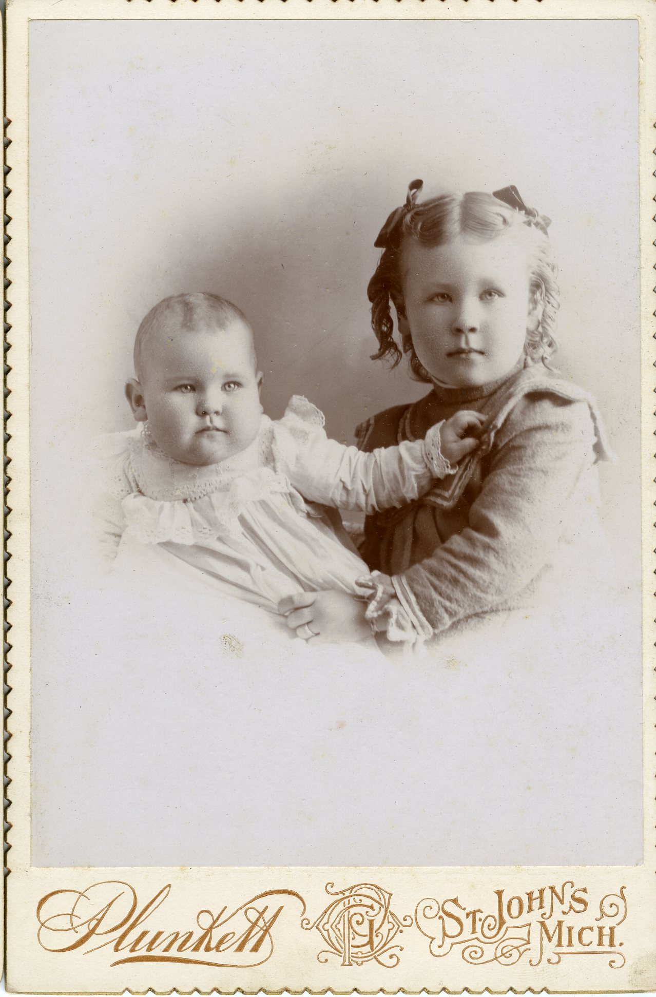 We add another locale to our puzzle to further confound Iggy: St John’s Michigan. The photographer was Plunkett. By the deckeled edges of the card we know this is about 1895, but Plunkett may have been in business in the 1880s as well.