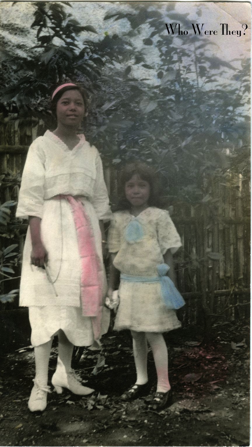This is the last of the hand tinted photos I have. They were all together, so perhaps they were owned by the same person who enjoyed tinting their photos. These two girls are wearing clothing that is distinctly 1920s-1930s. Each has a sash that was tinted. The older girl on the left is wearing gorgeous shoes, and is holding something that is connected to her sash at the waist. The younger girl is holding something in her hand, in between the two girls. They are pretty girls.