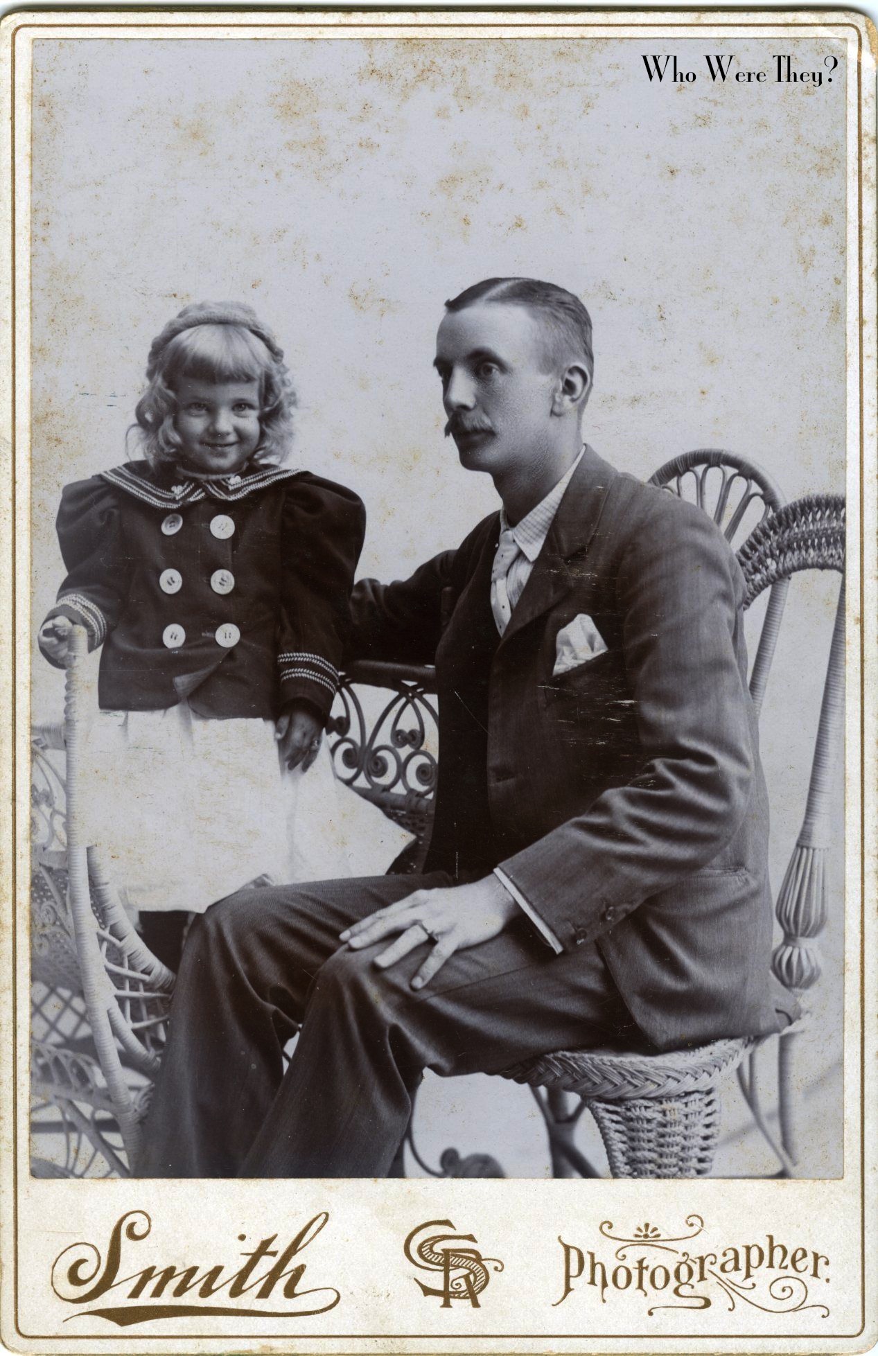 Today’s offering is a cabinet card made by Smith (probably C. R. Smith based on the monogram). The ornate wicker is much like that I’ve seen in photos from the 1890s. This girl is definitely her daddy’s best girl! First off, she has a fancy dress in the sailor style, curled hair, and you can tell in her expression. It’s lucky to find a great expression like that on a vintage cabinet card! Secondly, she is being photographed with her father. I have seen lots of photos of boys and their fathers, but not many like this one.