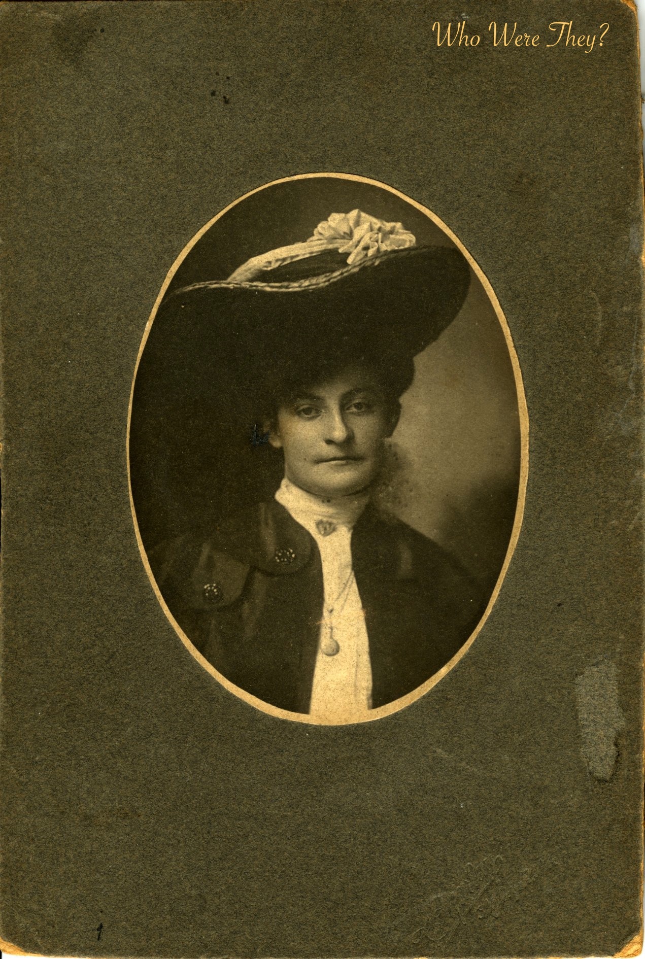 So here is photo #1. A woman in a very large hat. She has a distinctly 1900’s Edwardian dress, with the epaulettes coming over the shoulder. Her blouse underneath is crisp white, probably linen or cotton, and with a high neck. She has a necklace with possibly a locket and also a brooch. Her hat is simple but lovely. The size of the hat is a hint to the size of her skirt. As skirts became bigger, hats became smaller, and vice versa. So this lady’s skirts were likely the “hobble” style skirt, which was straight and could possibly have a tie around the knee area forcing women to hobble in what was considered a ladylike pace of very small steps.