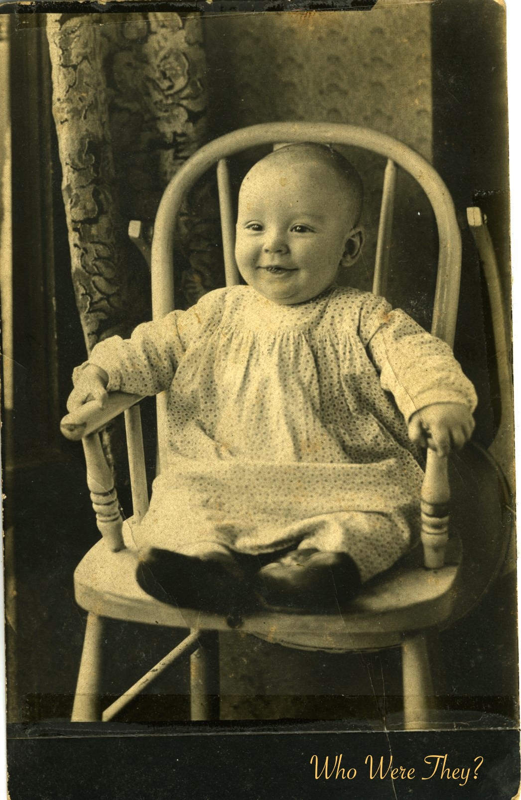 This little baby is happy! Baby is about 6 months or so by my guess, because s/he is sitting well and holding onto the arms of the chair. You can just see the tray folded back behind the high chair. This photo is number 9 in the Green Fan Album and is a snapshot obviously taken at home.