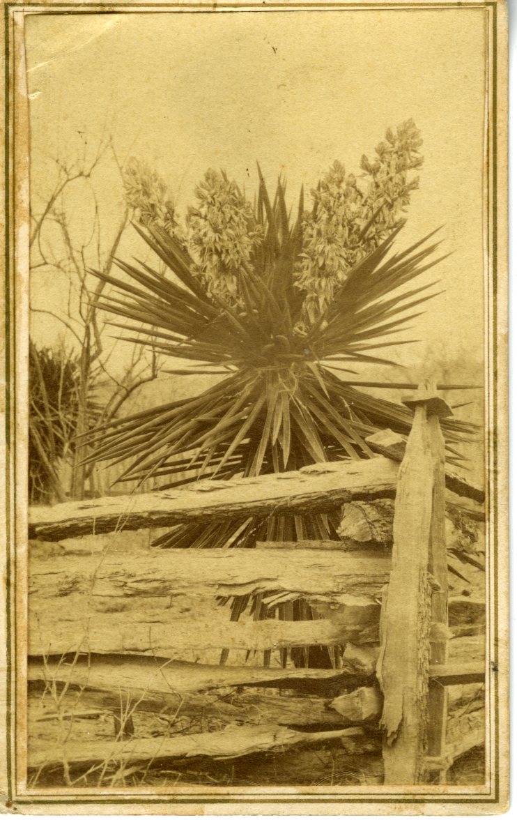 This CdV can be comfortably dated to the mid to late 1860s based on the square corners and border lines. Written on the back is “Spanish Dagger From San Antonio Texas.” The Spanish dagger plant is also known as the yucca gloriosa which is native to the American coastal southeast, growing in sand dunes. San Antonio is about 150 miles from Corpus Christi on the Texas Gulf Coast. According to the USDA, the yucca gloriosa is not known to grow in Texas.  Hrm. I found other images online that are similar to this Spanish Dagger in bloom to confirm what the original owner of the photo wrote.
