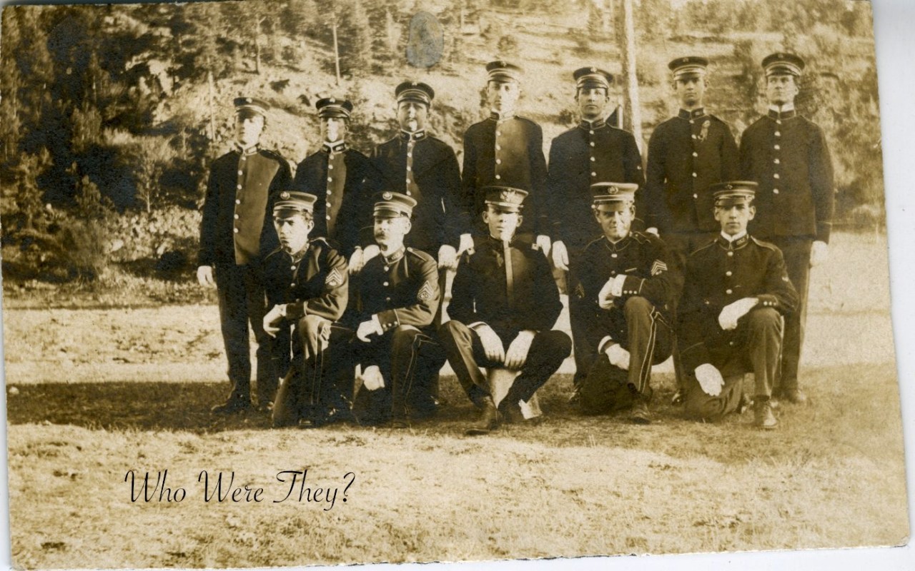 I think this a group is US Marines Squad with some “brass”. A squad was 9- and later 13-men lead by a squad leader who was a sergeant (I think this is the man second to the far right – front row) and the assistant squad leader was a corporal (I think this is the man on the far right – front row).