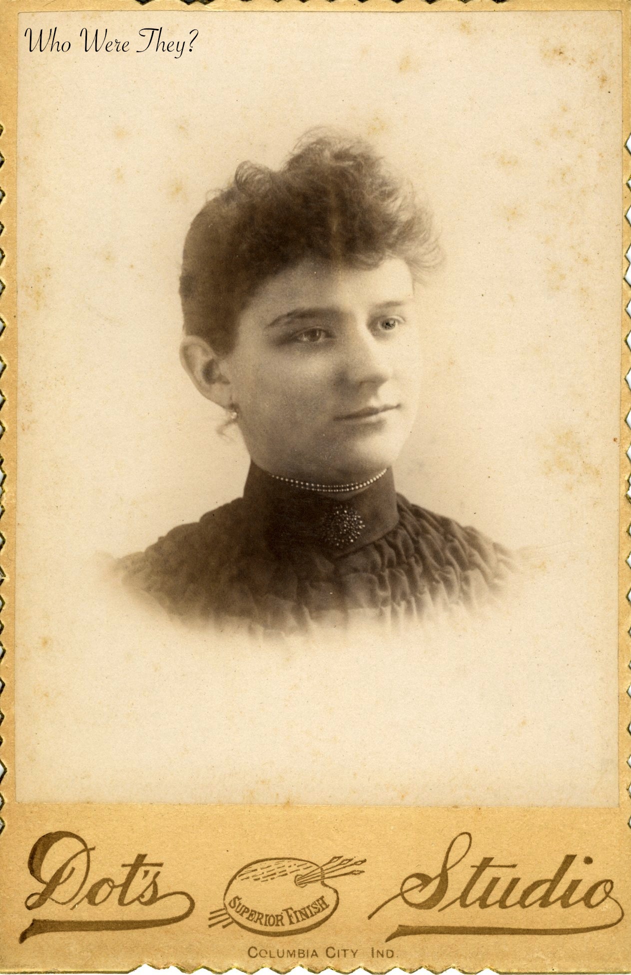 The photo was made by Dot’s Studio in Columbia City, Indiana. We know that the fancy deckled edges of the card stock were available between 1886-1900 but were most popular in the 1890s. I cannot see the sleeves of the dress to give a better date, but I’ll go with the 1890s.
