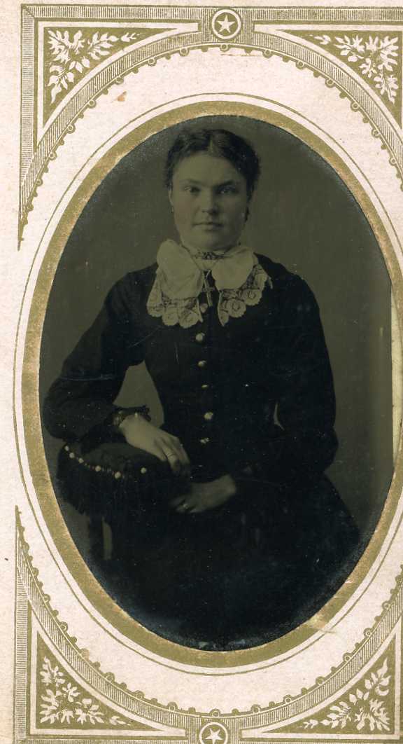 Here we have another tintype that Ray Jackson sent me. The sleeve was intact, and written on the back was Stella Marshall. By the dress I will date this to the 1880s, but that is about as firm as I can get for you because I can’t see the clothing very well. The image has tinted cheeks, which the photographer would have done in his studio right at the time of the sitting. I learned quite a bit about tintypes recently. Many tintypes were made by itinerant or traveling photographers because the iron plates (not actually tin) would not break the way glass plates would. The repeating camera, or multiplying camera, was invented in 1862 or so, and made multiple images at the same time. The photographer then cut the images apart with tin snips, which probably gave rise to the misnomer “tin type.” While the studio tin type lost its cachet sometime in the 1880s-1890s, they were still available at amusement parks and venues such as Coney Island and Niagra Falls. The subjects were frequently posed with props that signified where the photo was made – a barrel for Niagra Falls, a strong man cutout for Coney Island, etc. They were cheap souvenirs for an American public that was enjoying the latest in leisure activities. Tin types remained available for another thirty years or so.