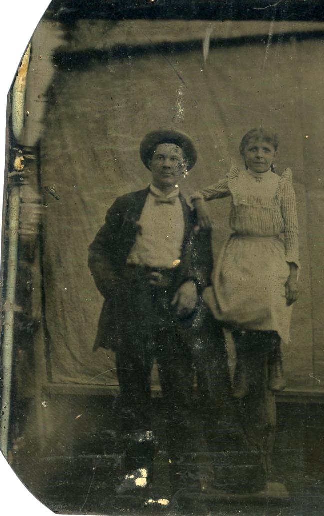 This little tin type has lost its paper sleeve and so any chance of identifying this pair is lost to the ages. By the girl’s dress, I would speculate the photo was taken in the 1890s. It’s difficult to tell what exactly she is standing or sitting on – a tree stump? Her father has a nice bow tie and hat. I suspect this is one of those tin types made by an itinerant photographer. You can see the canvas backdrop that looks pretty shoddy and doesn’t even go all the way to the ground. Was it the side of a tent? This photo is courtesy of Ray Jackson.