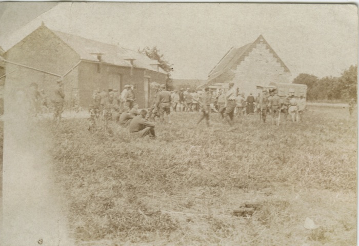 This photo is terribly faded but on enlargement you can see that it consists of a group of men milling around in front of a couple buildings. There is a wagon in front of the building to the right. On looking closely the men appear to be in uniform, leading me to wonder if they are a group of World War 1 soldiers. What do you think?