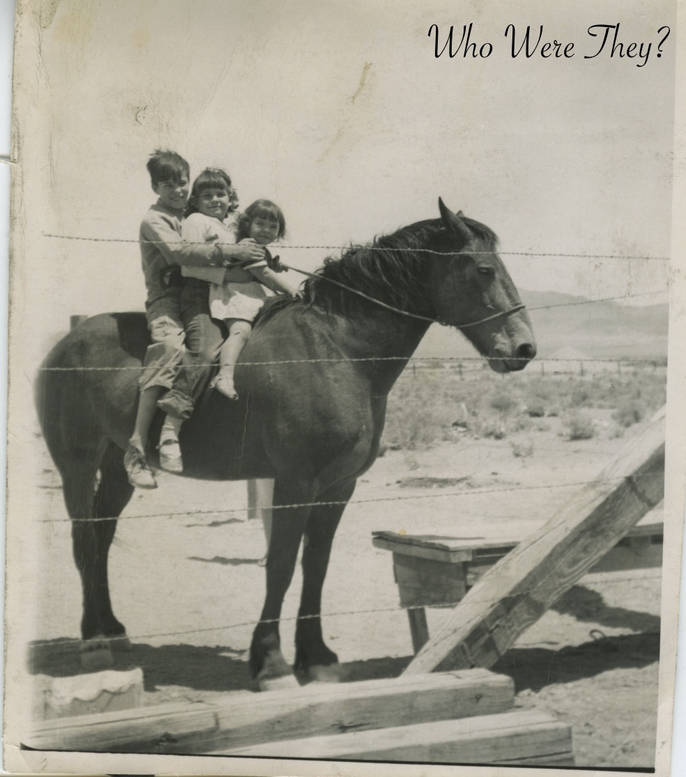Today’s snapshot of three kids on a horse was taken somewhere in the desert. You can tell by the scrub brush in the background. The kids are stair steps, with the big brother in back, middle sister in the middle, and younger sister in front. Big brother has his arm around both of them, keeping them safe. There’s a barbed-wire fence between the kids and the photographer. It might be the juxtaposition of the small girl on the horse, but the horse looks big to me. On enlarging the image, there is *something* behind the horse and I wonder if it is mom or dad.