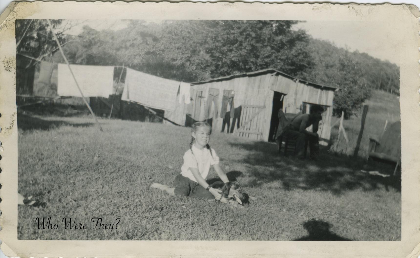 Today’s photo shows us a girl in the yard with her dog, sheets and overall on the line behind her. The clothesline appears to have been strung from the corner of the outbuilding along to somewhere out of frame. In the shade you can see someone – I’m guessing her brother – sitting in a chair and there is an Adirondak style chair next to him. The photographer’s shadow is in the lower front of frame. This is a great photo of a normal day in the backyard.