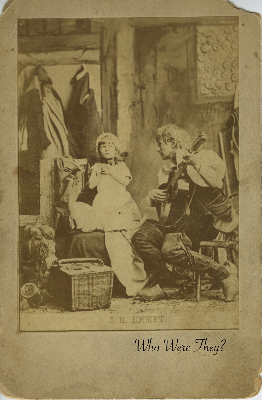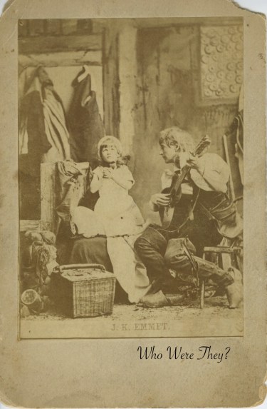 The photograph itself is quite interesting, to say the least. J. K. Emmet appears to be wearing wooden shoes and leather (?) gaiters of some type, a puffed sleeve blouse and possibly even bib overalls, all while strumming the guitar and looking fondly upon the young child in the center of the photo. Yes, I did compare the profile of the man to two known photos of J. K. Emmet and by the nose, it’s him. The set they are on is quite cluttered and messy, with a picnic basket, hanging coats in the background and some sort of odd mess to the left. Could this be depicting the stage of their show, whatever it may have been? Surely it was Dutch themed, which would explain the shoes, but beyond that, I have no clue what is going on there. However, it was popular at the time to stage a vignette from a current musical show and sell the photographs, much like modern trading cards. This particular card is fairly rough, and at some point had been glued into something, maybe a photo album or frame, as there is a large splotch on the back. No photographer was named. The photo is on loan from my friend Pauline and it was found among numerous other unidentified family photographs from the 19th century. Someone in her family history liked vaudeville actor J. K. Emmet, apparently.