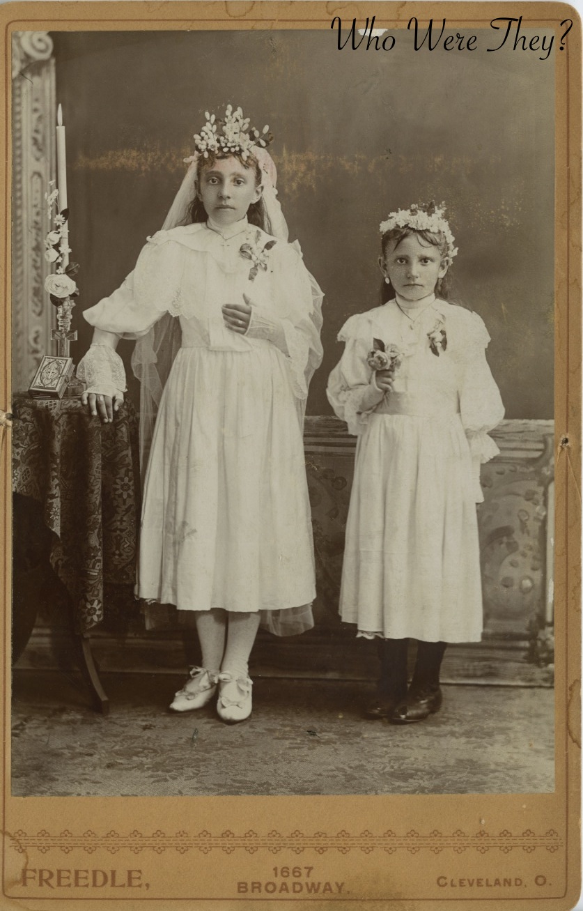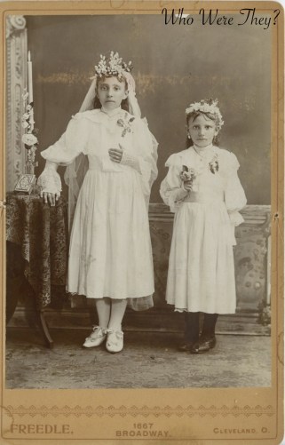 These girls must be related to our Leaning Lady, being that the photo was also made by Freedle and they come from the Leaf Album. It is unknown what their relation was though. I believe this photo to be a First Holy Communion for the older girl and some other type of religious milestone for the younger girl. I freely admit I am limited in my knowledge of religious activities, so if you have a speculation please add in to the comments section!