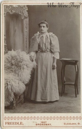 The latest entry from the Leaf Album and all I can say is wow. That fur is really disreputable; I can’t imagine what the photographer thought this would say in an artistic sense about his young female subject. Her dress is quite statement enough, in my opinion. The sleeves aren’t as large or prominent as the last big sleeve image from the album, but they really don’t do much for this lady’s look. They appear to be 3/4 bell sleeves, almost pagoda sleeves. Then there is some sort of lacy undersleeve and the lace adornment at the neckline. The fabric is checkered as well, so it makes me dizzy to look at it too long. Finally, the gathered blouse style bodice just makes the whole thing look sloppy to me. Sigh, the things women will do for fashion! She is fairly young, so perhaps this was the height of style for young women in the mid to late 1890s.