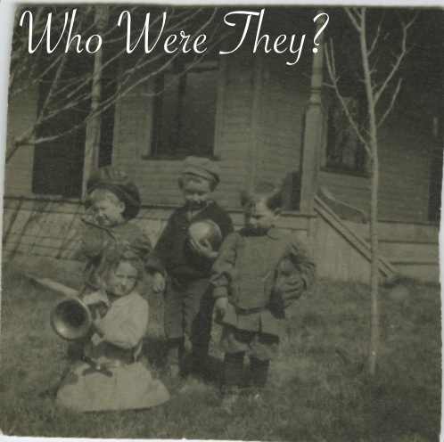 This photo is tiny (only 1.5×1.5), but I’m leaving it large so you can see all the fun details. It’s almost as if the photographer said “grab your favorite thing and come out for a photo.” We see a catcher’s mitt, a ball, something looking like a bow & arrow, and a trumpet. The boy on the left certainly has an unusual hat on. I can’t even describe it. They look like a rough and tumble group of kids who had a lot of fun growing up before all the scary things that keep kids indoors these days.