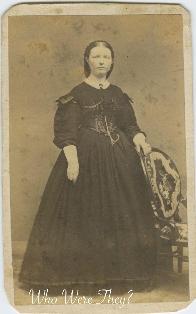 This CdV from the 1860s is identified as Catherine Shull. I picked this one up because I found her dress bodice to be really unusual. It almost looks as though she is wearing a black corset on the outside of her dress. Since I know that would never happen, my next guess is that she has on what is called a corselet/corslet, Swiss body or Swiss waist. For young women, a popular fashion was this large belt-corset hybrid.