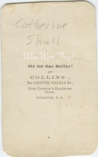 Miss Shull posed for the Collins gallery at Number 8 South Salina Street, Syracuse NY. The gallery was located over Everson’s Hardware store. There are a number of Catherine Shulls living in New York with a birth year in the 1840s. I am guessing she is between 15-20 years of age in this photo. Unfortunately, there are so many Catherine Shulls, it is unlikely we can truly identify which one this one is.