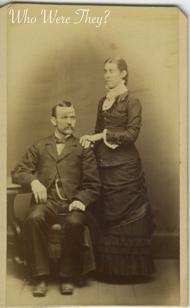 This CdV is of an attractive couple posed in such a way that we see 3/4 of each of their faces. The dress leads me to believe this is from the 1870s. It reminds me very much of the early Natural Form era. There is no bustle to be seen, no flounces behind her, yet plenty of pleated trim and lacy cuffs. The skirt is relatively straight and the bodice appears to dip below the waist, which was on trend with the Natural Form look – to elongate the body.