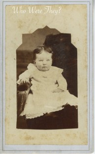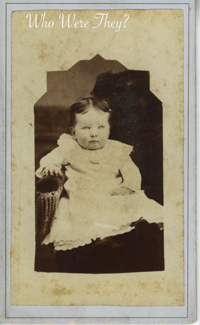 I picked up this CdV because of the child’s eyes. They are quite haunting…and a little creepy. Click the photo to enlarge it. I wondered if this might be an example of a photographer having painted eyes onto the photo plate of a memento mori photo. The shop was closing, I had to go, so I couldn’t sit and examine the photo there (besides I didn’t have my magnifying glass with me, my poor eyeballs don’t see like they used to!). After having enlarged the photo on the computer, I have concluded that the child has light colored eyes, probably light blue, but is also quite alive. Often in old photos, the light eye colors photograph in light gray. Green and blue eyes have many variations to their natural colors, but the old photo processing couldn’t capture the nuances of them. With such light eyes on this baby, they photograph almost white.