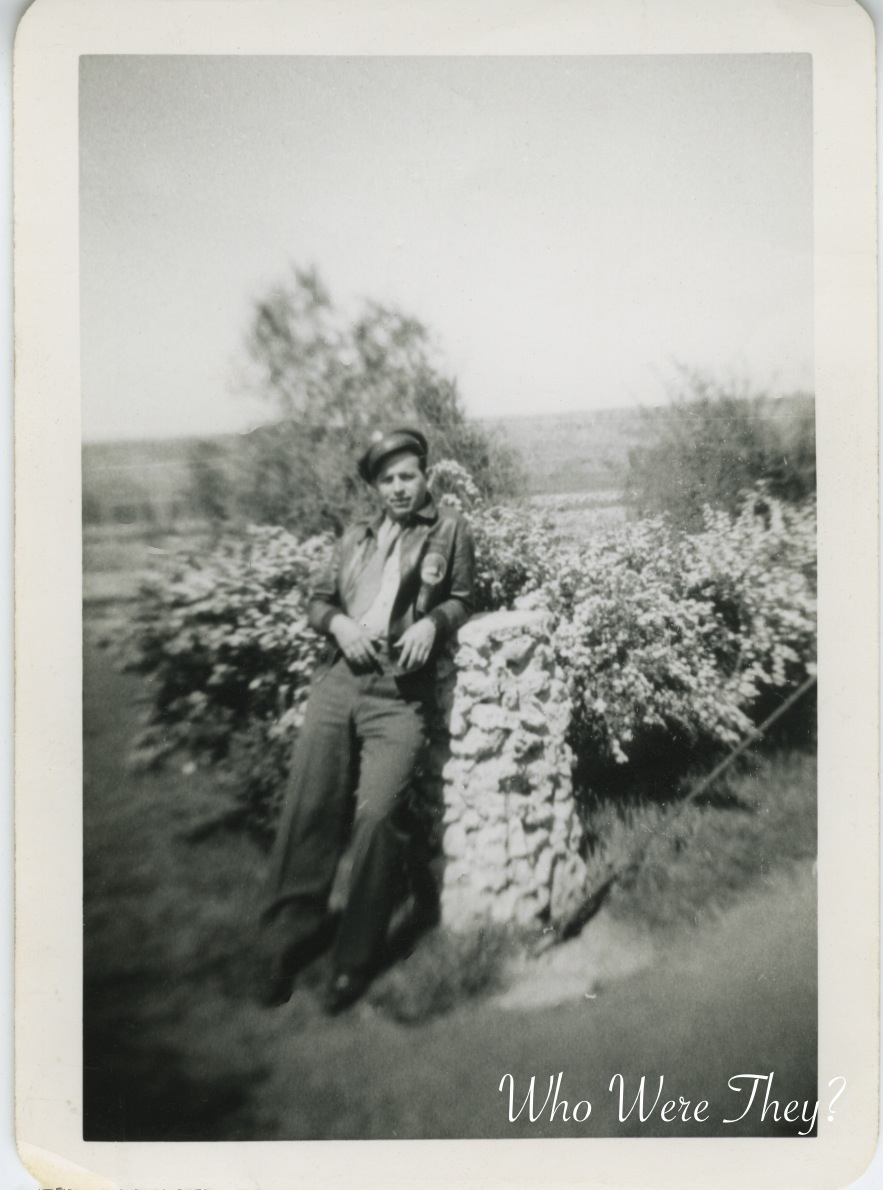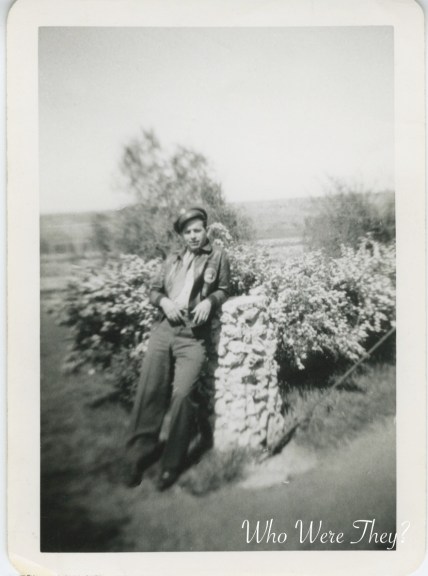 I love this photo of the fellow lounging against the stone pillar. The edges of the image are blurred, he is looking at the camera with that “devil may care” look, the countryside rolls off behind the blooming bushes that frame the scene. It is a well composed photo of a military fellow of some sort. And yet…and yet, I had this flash of inspiration that made me wonder if the man is leaning on the post because he just cannot stand up straight any longer! What do you think?