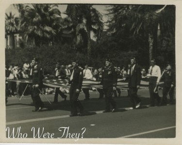 This is a snapshot of VFW members marching in a parade, displaying the American flag. Thank you, gentlemen.