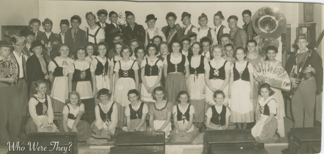 It’s an Oktoberfest photo! Looks American based on the school desks, maybe 1940-50s? The horn on the left is a very specific design that has only one maker and is associated with NYC. The bassoon on the right is also not a typical German band instrument. The fan lady is just oddly out of place which says school production. Almost the “Sound of Music” but I don’t see the von Trapp family!
