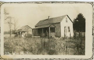 This photo dates from the early to mid 20th century or so and documents a time when farmhouses were still very common. This particular house is a two story affair but doesn’t appear to have been quite large – perhaps having a kitchen/eating/lounging area downstairs and two or three bedrooms upstairs. There is a smaller outbuilding off to the left but it could be a barn, cook house, or luxury potty, haha. Ok, not really a potty. The yard is overgrown with weeds which makes me wonder if the fellow standing by the porch just bought the property, or maybe is saying his last goodbye. I have no location or date for the photo.