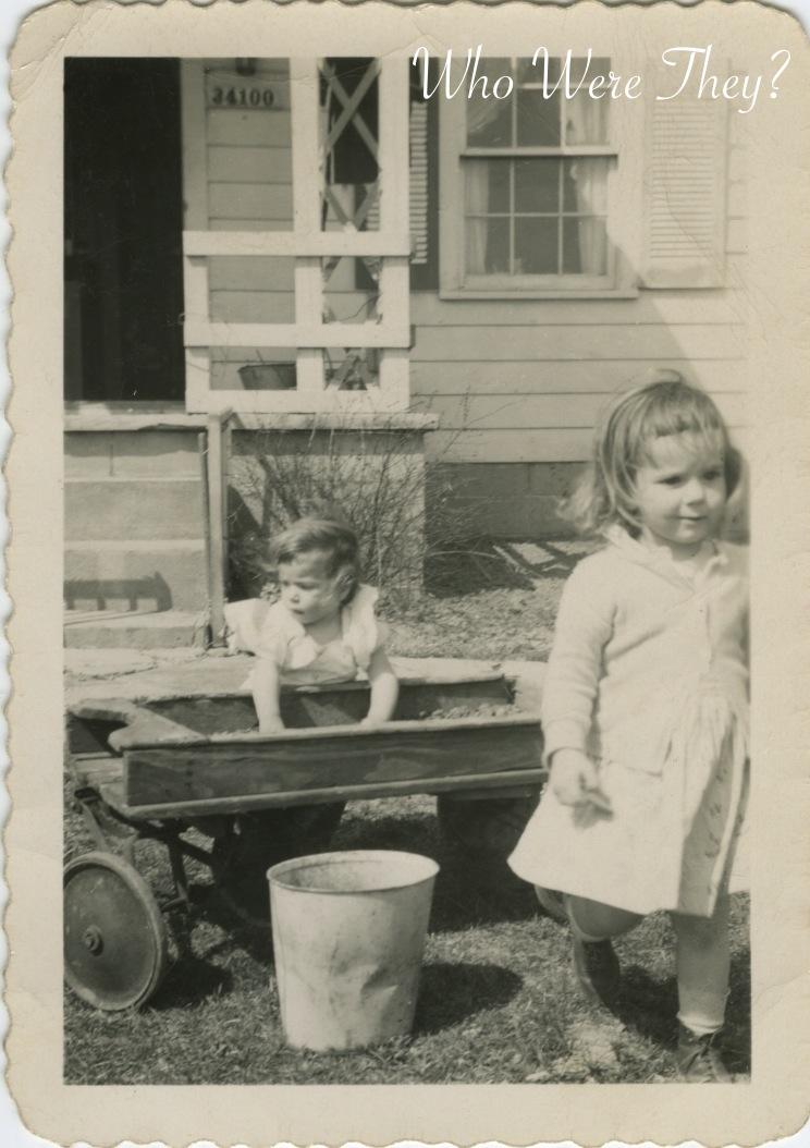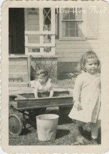 This snapshot circa the 1950s features a fantastic wooden wagon, a bucket and two little girls. I always wonder what the story was. What activity or event prompted the parent to snap the photo at that instant? With today’s digital images so easily deleted, replaced, and manipulated, it is difficult for us to imagine saving a shot so as not to waste film. I can remember the frustration of getting a bad shot when I picked up my prints from the developer! Sometimes those old, bad, snapshots are funny – such as double exposures, chopped off heads, funny facial expressions (the open mouth mid word is my favorite) and movement blurs. Whatever the inspiration on this long ago day, I hope the photo brought the family happy memories!