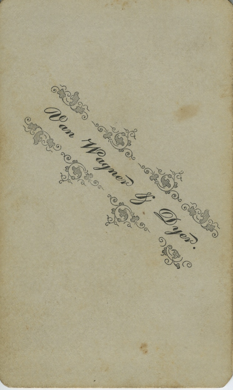 Had this photo been taken of me, I would not like it because the ribbon on this lady’s hair is askew. It is somehow flopped forward onto her head. Whether that was an accident or the ribbon just didn’t cooperate we can never know. Regardless, she is serene and maybe a bit pensive. The image was made by Van Wagner & Dyer of Baltimore, MD. The studio was known to be in operation in the 1870s, and so that is how I will date the photo, although it could possibly be late 1860s. The corners of the card appear to have been cut rather than made rounded. Also the imaged masked in the center of the card is one of the signatures of CdV portraiture in the 1860s. In the 70s more options became available to photographers, and we begin to see the oval mounts, colored cards, full size images, etc.