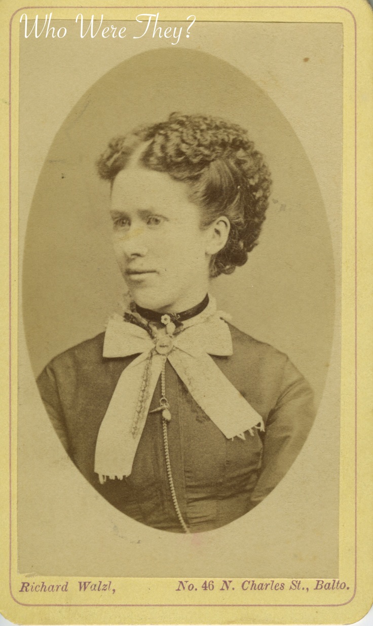 The photographer she selected to make her portrait was Richard Walzl of No. 46 N. Charles Street, Baltimore, MD. Walzl was apparently well known and prolific in the Baltimore area, having written a book (The Photographer’s Friend), photographed Abraham Lincoln’s summer cottage and other landmarks in and around Baltimore and Washington DC in stereoviews. He was born in 1843 and lived until 1899.