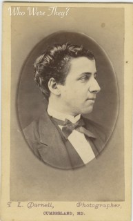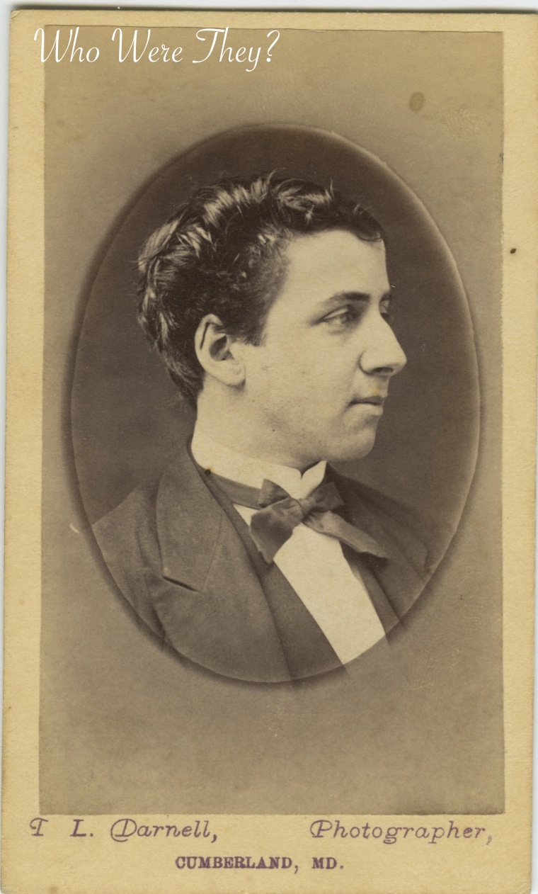A handsome young man poses for his portrait in profile in the studio of T. L. Darnell in Cumberland, MD. This photo is definitely in the 1870s. The style of mount is rather common for that decade. This man’s hair is wavy but brushed back from his face. He has a bow tie and you can just see his vest under his coat.