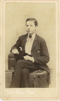 This young fellow is in the space next to our “fanciful” lady of the last post. However with a dearth of names, I cannot tell you if they were related or not. I noticed that the chair he is sitting in is rather tattered along the fringe. Perhaps an indication that the studio was doing a bustling business, or that they were incredibly frugal. The photographer in question was McLaughlin & Nimmo, who had a “new and improved skylight” such that it warranted mention on their cards. The skylights were very important to a photographers business because they did not have artificial lighting that was effective at improving an exposure. You may have noticed that studios were often on the second floor of a building – lending themselves access to skylights. It is also interesting to note their pricing – Cartes de Visite were $2.50 per dozen and a large photograph and frame was $3.00. They also mention tinting of photos, which leads me to wondering if his tie has been tinted or if there is an unusual stain on the photo. What do you think?
