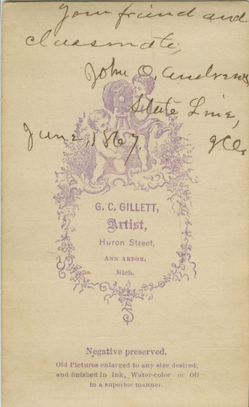 While digging through the photos at Truly Tattered I found this wonderful example of how CdVs (cartes de visite) were used. The young man pictured wrote a brief note on the back, which says “your friend and classmate, John O. Andrews, State Line (something) June 1867.” The photo was made in Ann Arbor, Michigan.