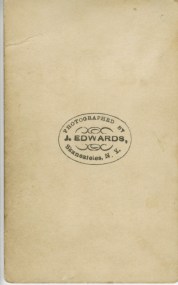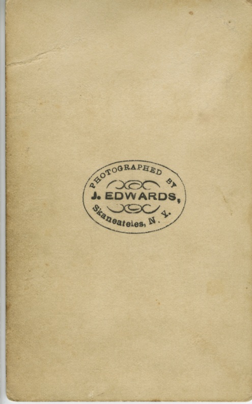 UPDATE: Fabulous, I heard from Beth at the Skaneateles Historical Society who confirmed the photographer was in fact Johnathan Edwards. Hurray! Edwards was born April 18, 1826 and was the son of Thadieus Edwards. As a child he learned painting, and later became a daguerrian artist in the 1840s. This evolved into photography and he had a gallery in Skaneateles until 1870s. At that time, he sold his business and retired to be a farmer (some relaxing, right?). However, he must have missed his true calling and went back to painting in 1875. He continued at that until he died August 25, 1900. He and his wife Angeline Aldridge had been married 50 years by that point. They had a daughter and a son. Edwards outlived his siblings (4 brothers, 1 sister) and is buried in Lakeview Cemetery in Skaneateles. Also during the course of his life, Edwards had been a constable and deputy sheriff for the village. Thank you again, Beth!